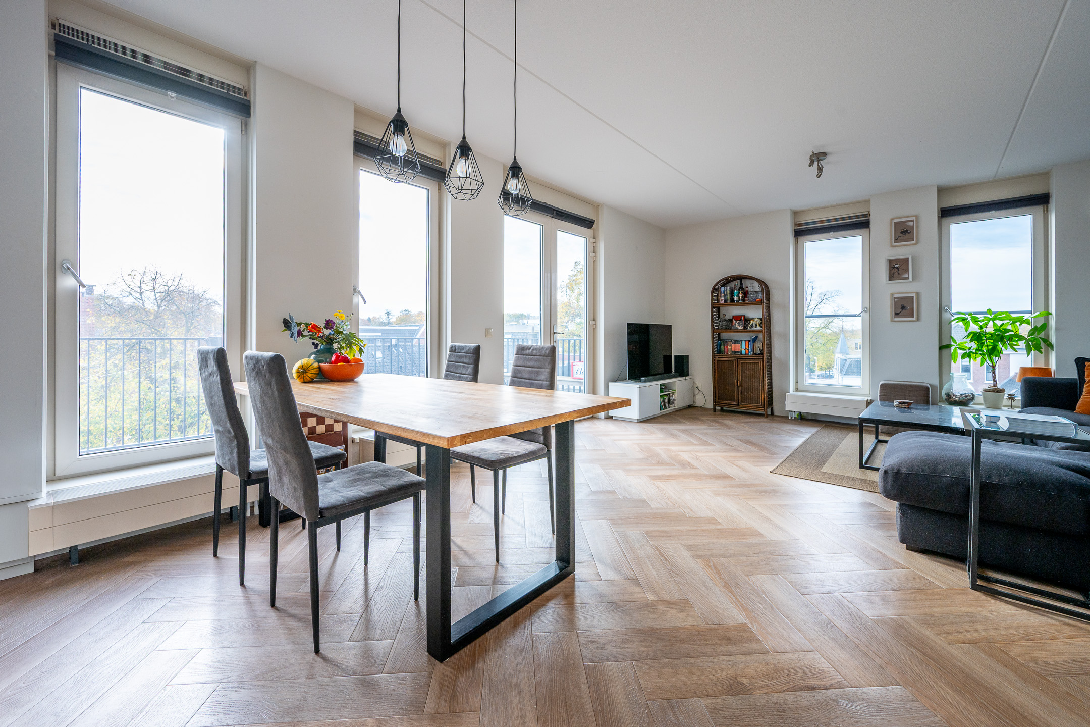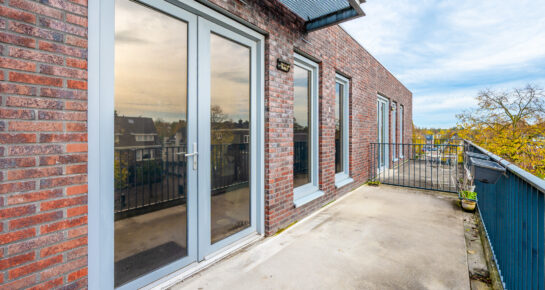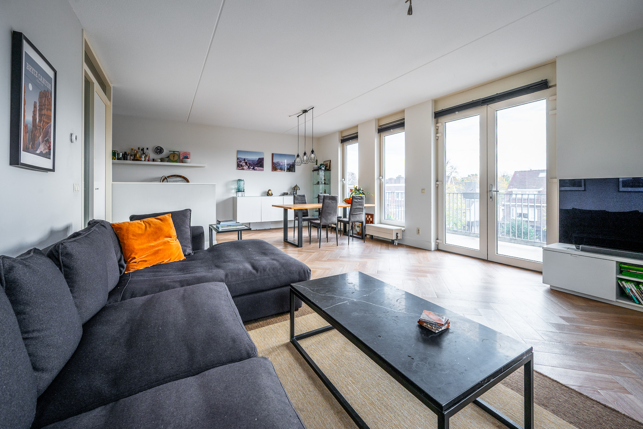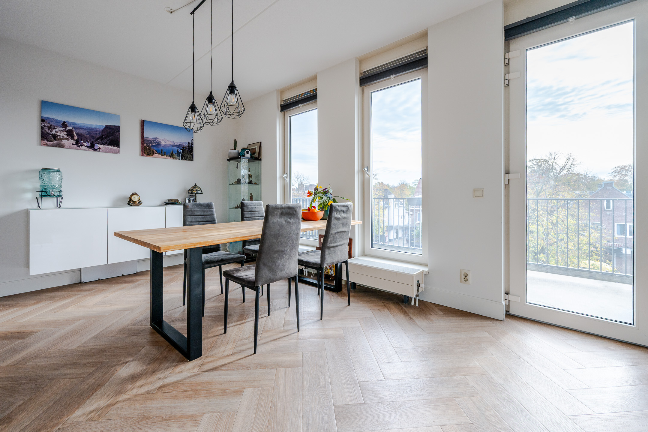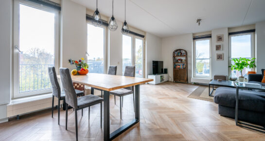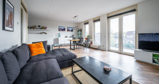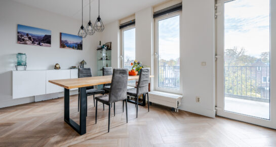 De woonkamer is ruim en licht, met voldoende plek voor een comfortabele zithoek en eettafel. Via de openslaande deuren stap je het royale balkon het zuidoosten op – een fijne plek om van de zon te genieten en even buiten te zijn.