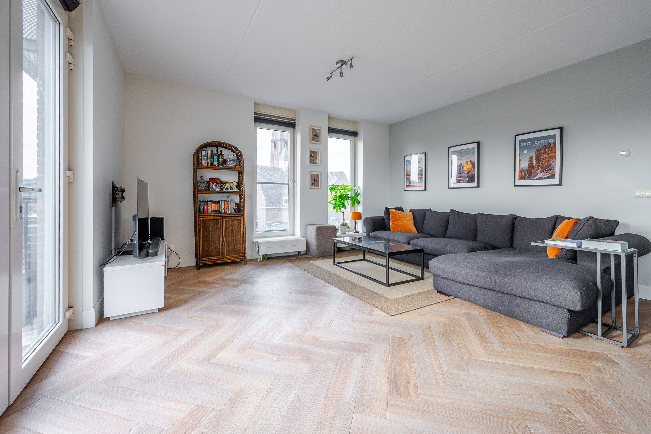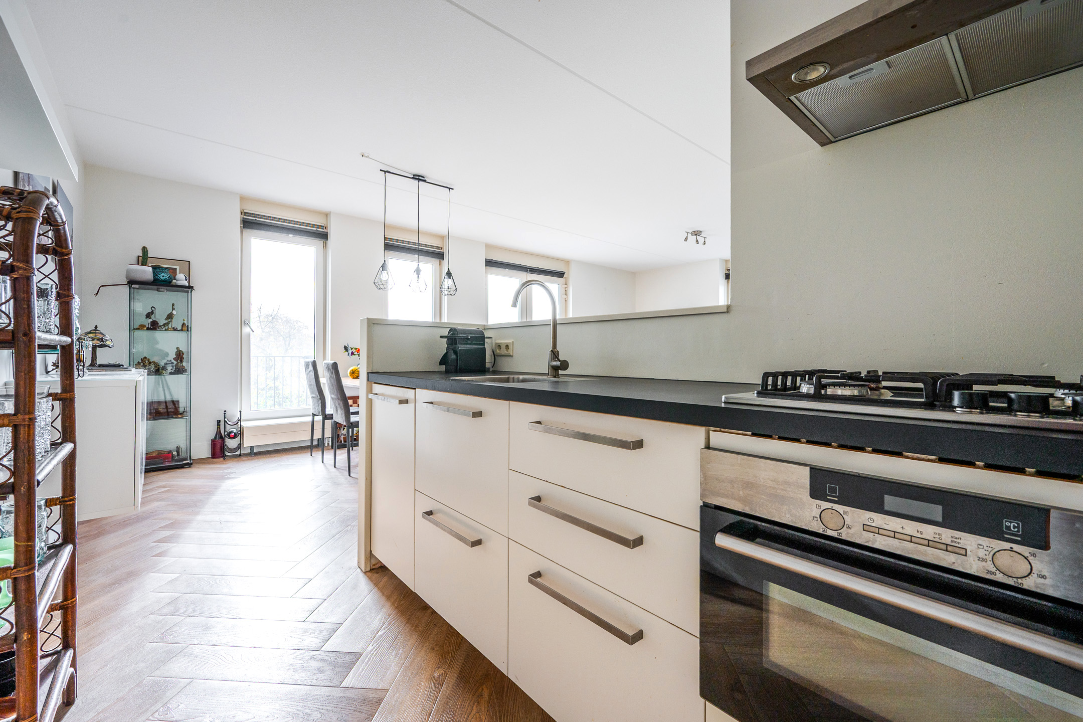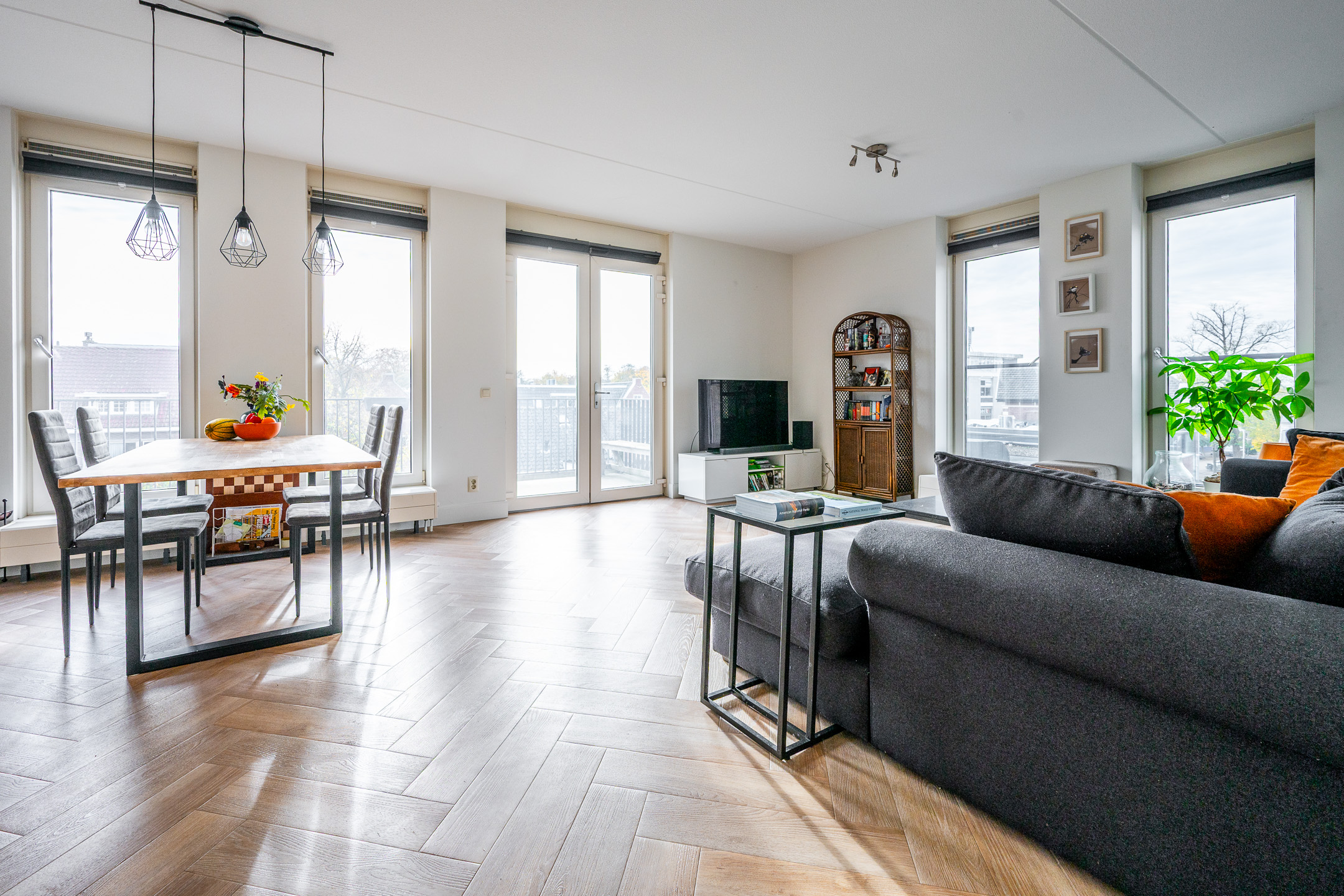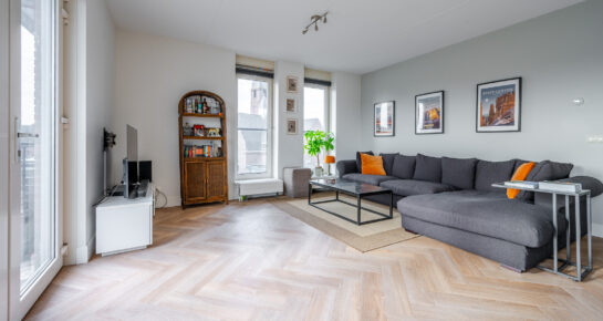 De woonkamer is ruim en licht, met voldoende plek voor een comfortabele zithoek en eettafel. Via de openslaande deuren stap je het royale balkon het zuidoosten op – een fijne plek om van de zon te genieten en even buiten te zijn.