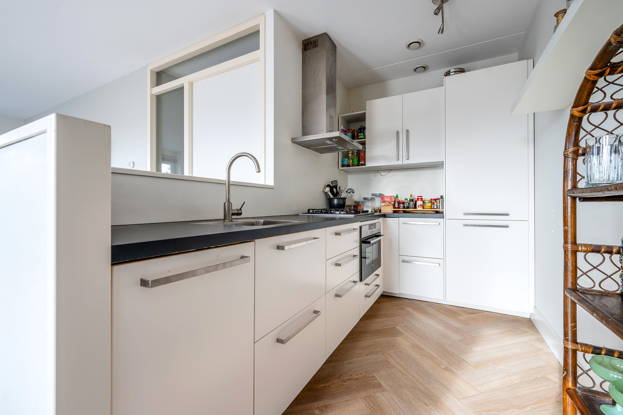 De moderne open keuken met inbouwapparatuur is praktisch ingedeeld. Je kookt hier met gemak, terwijl je gezellig contact houdt met de woonkamer.