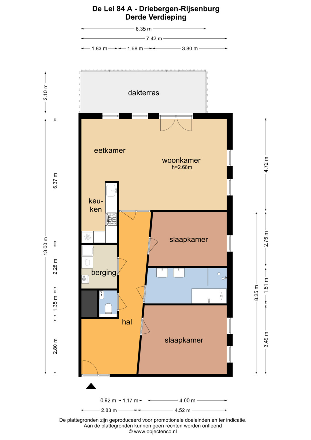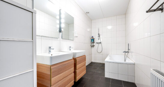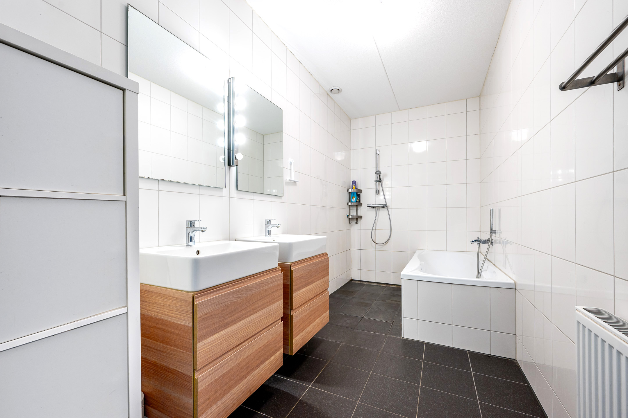 Verder zijn er twee ruime slaapkamers, met genoeg ruimte voor kasten of een werkplek. De badkamer is netjes afgewerkt en voorzien van een douche, bad, dubbel wastafelmeubel en modern sanitair.