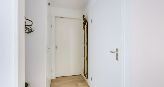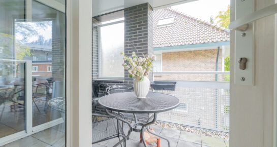 Grenzend aan de woonkamer ligt het balkon op het zuidwesten, bereikbaar via openslaande deuren. Binnen en buiten lopen hier prachtig in elkaar over. Op zonnige middagen of lange zomeravonden is dit de perfecte plek om te genieten van een goed boek, een kop koffie of een glas wijn in de warme avondzon.
