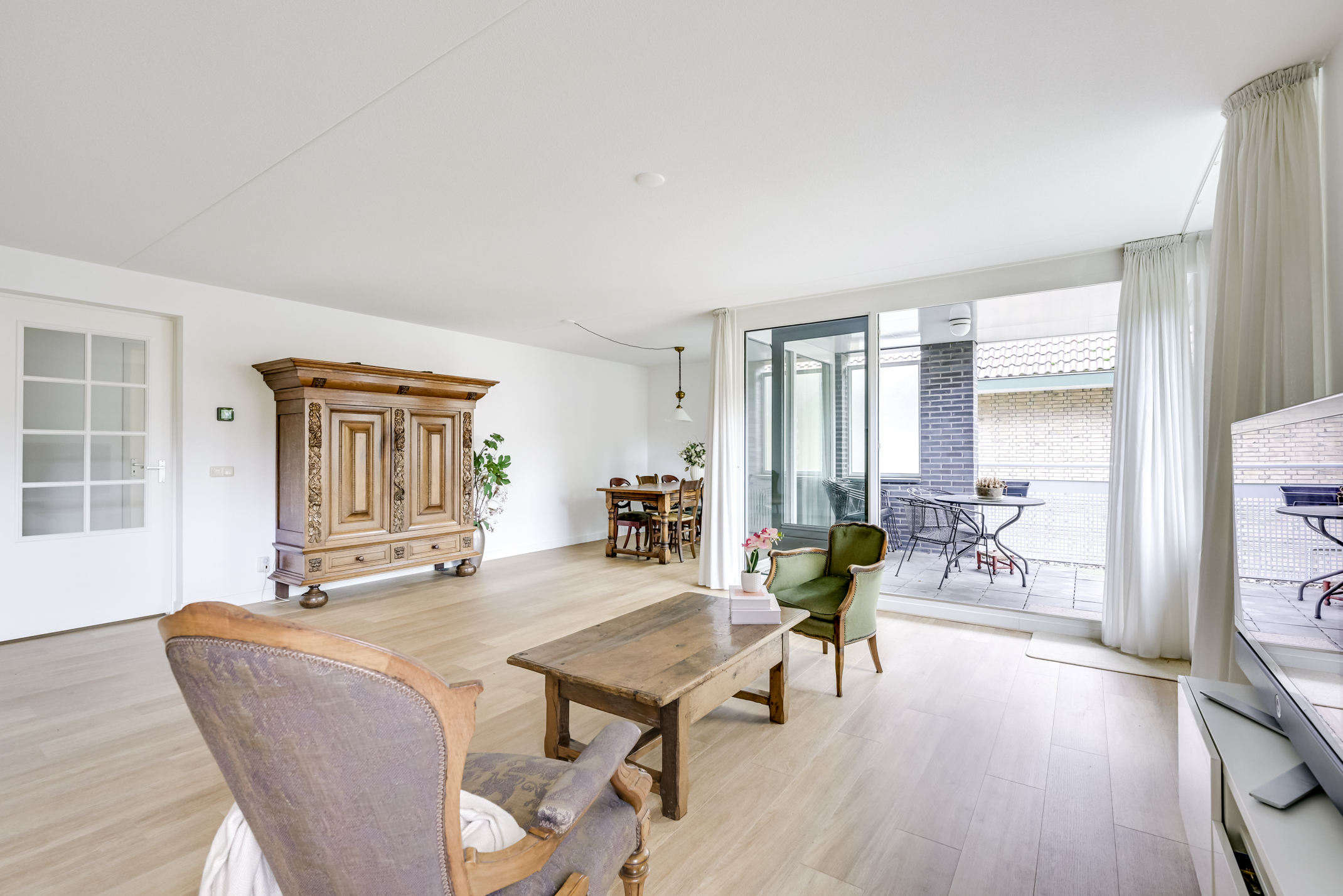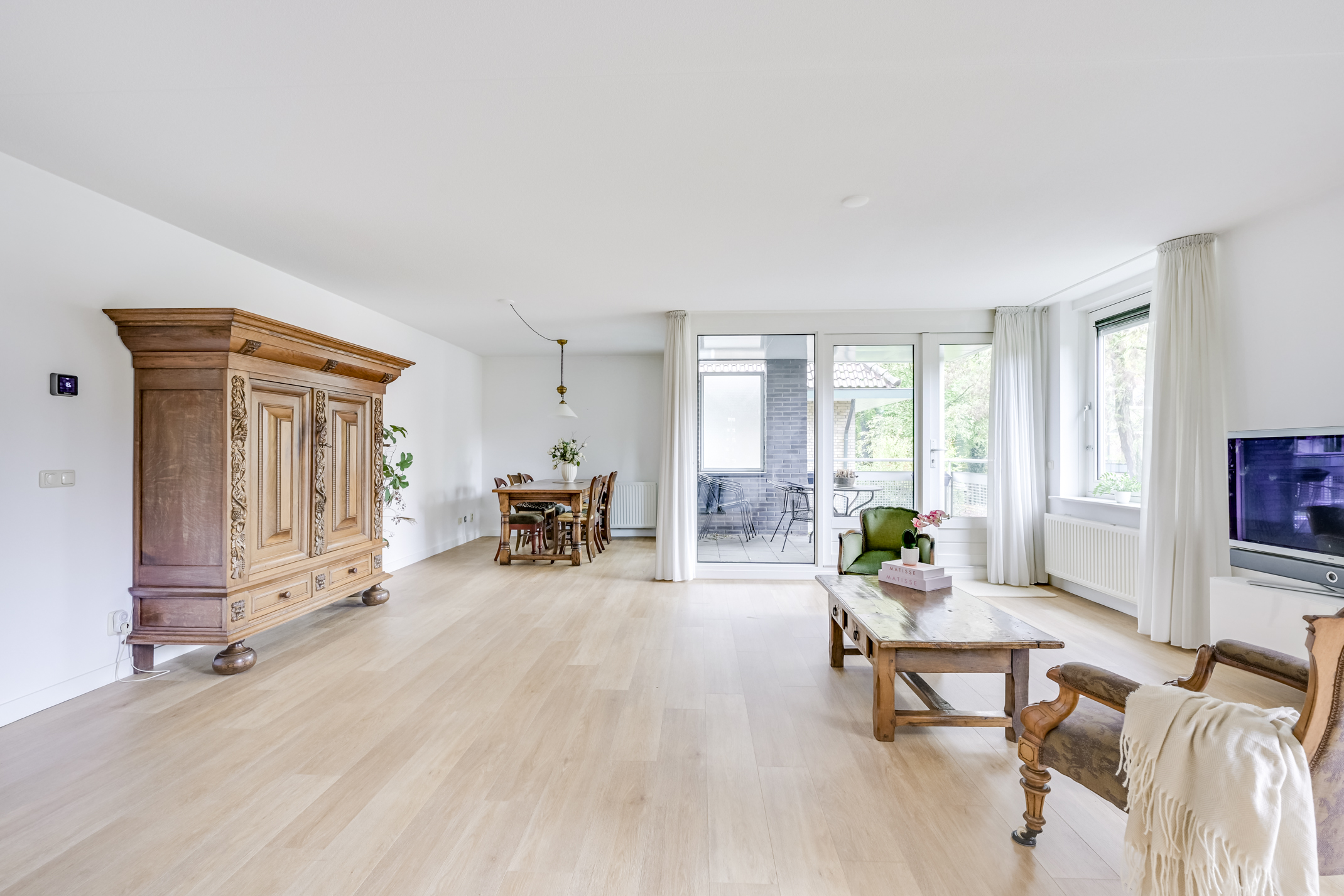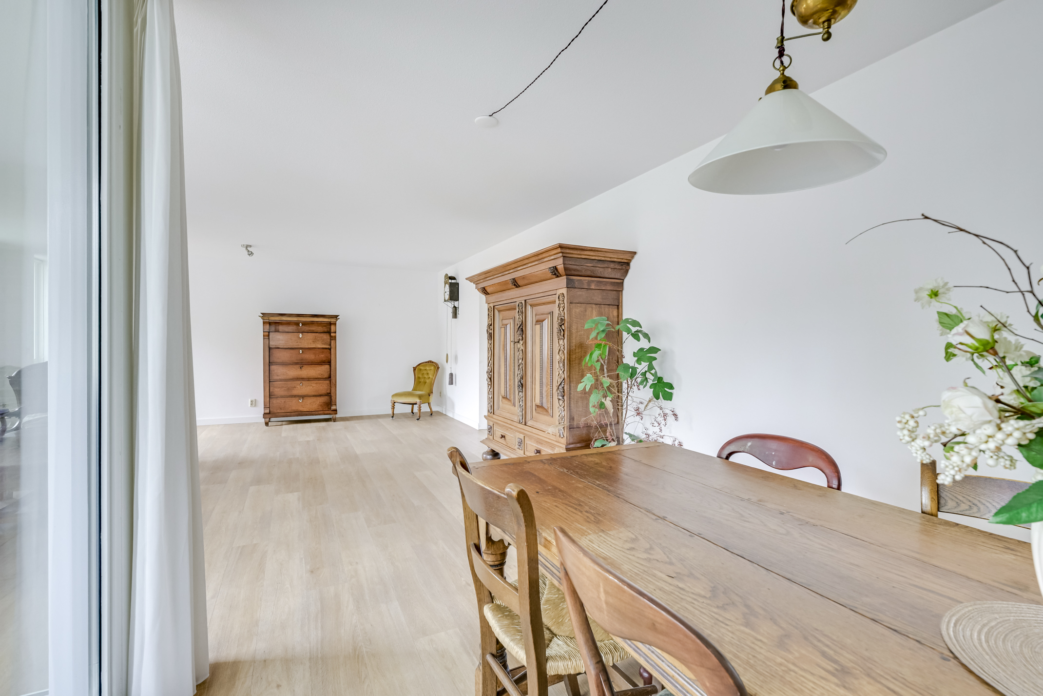 Stap binnen in dit ruime appartement van maar liefst 118 m² woonoppervlak en voel direct de ontspannen sfeer die deze plek uitstraalt. De woonkamer is royaal opgezet en biedt volop ruimte voor een gezellige zithoek én een grote eettafel waar u moeiteloos vrienden of familie kunt ontvangen. Dankzij de fijne indeling en de grote raampartijen geniet u hier van een prettige lichtinval en een gevoel van vrijheid.