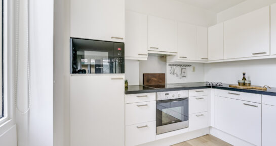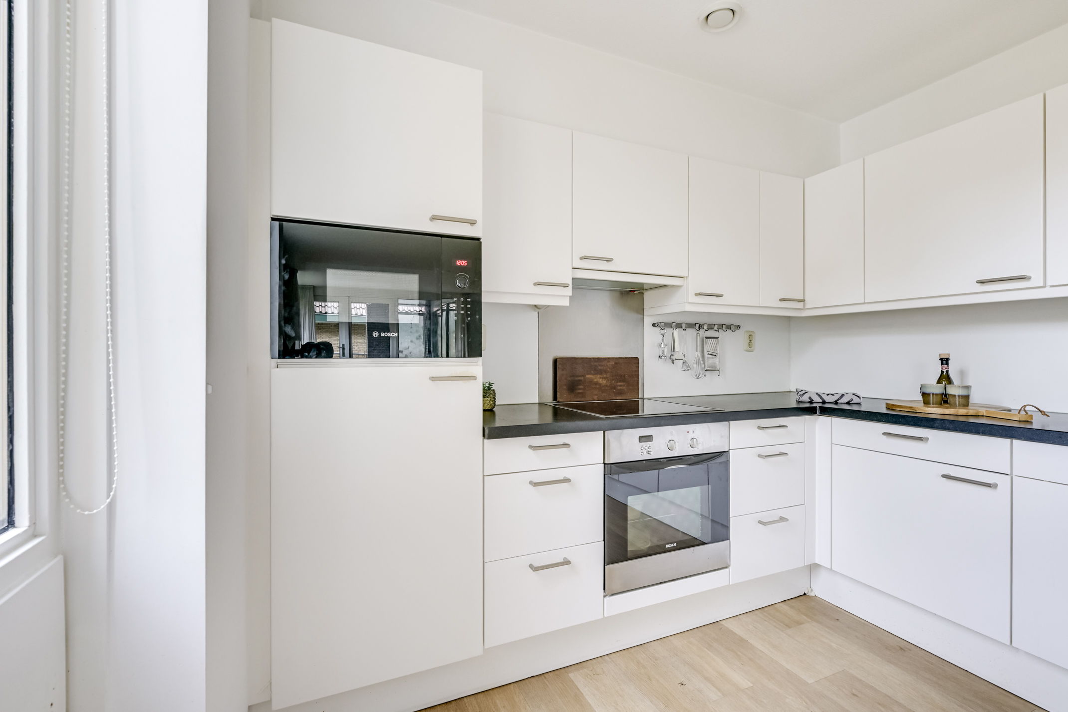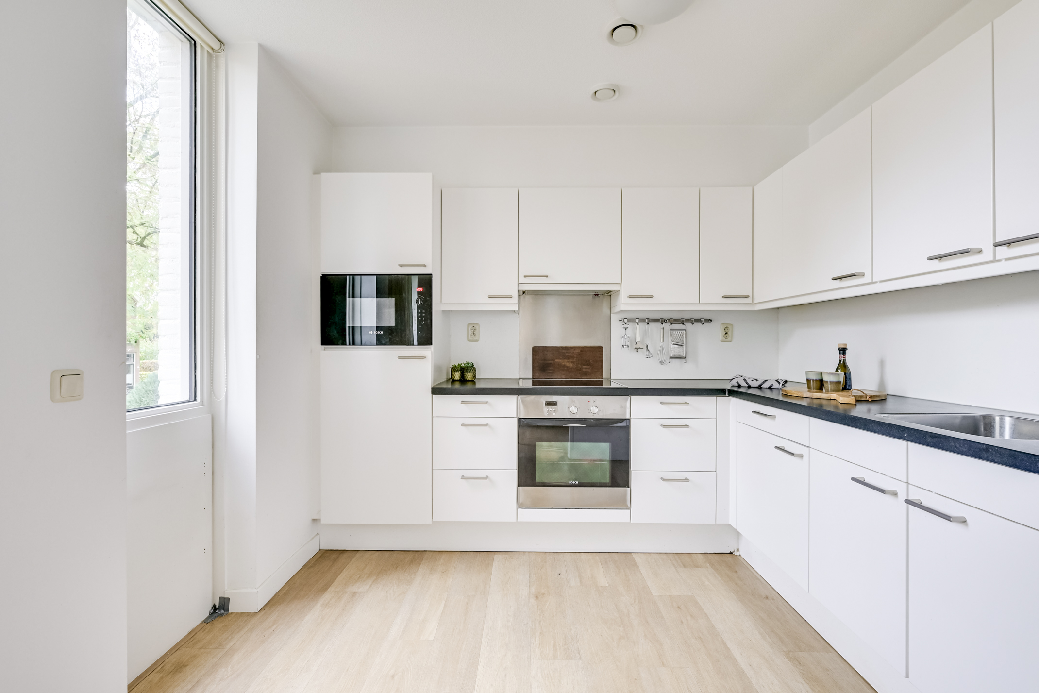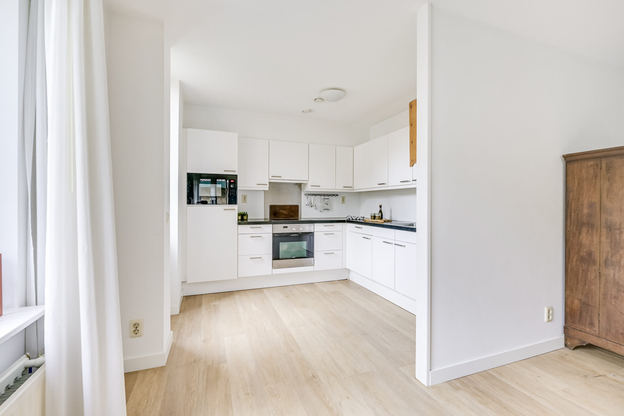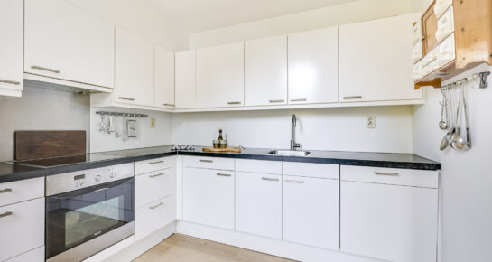 De keuken, uitgevoerd in een praktische L-opstelling, is van alle gemakken voorzien. Hier kookt u met plezier, terwijl u eenvoudig in contact blijft met de rest van de woonkamer. De moderne afwerking, de ruime werkbladen en de complete set inbouwapparatuur maken dit tot een heerlijke plek om te koken.