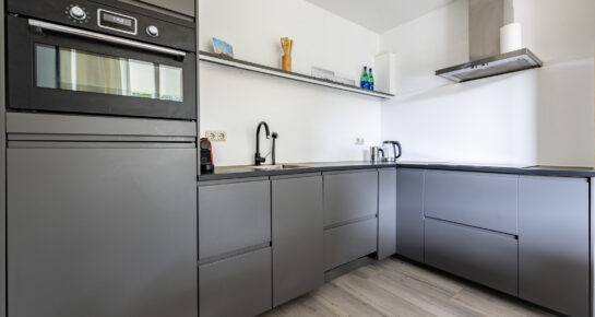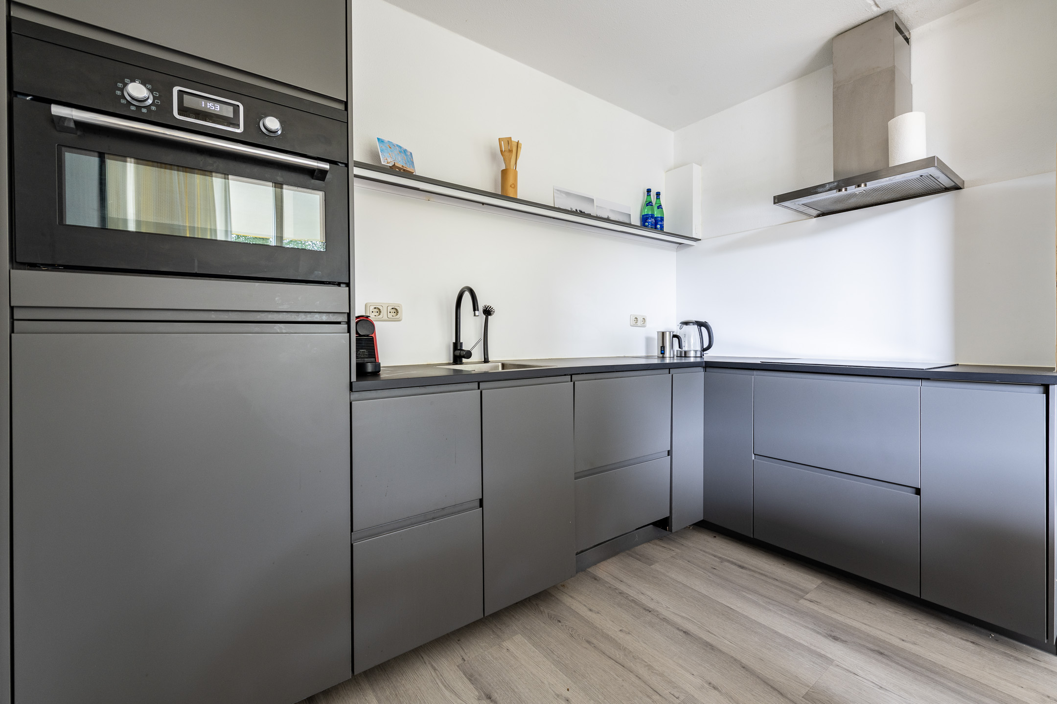 De halfopen keuken is functioneel opgezet en staat in open verbinding met de woonruimte, wat zorgt voor een open en ruimtelijk gevoel.