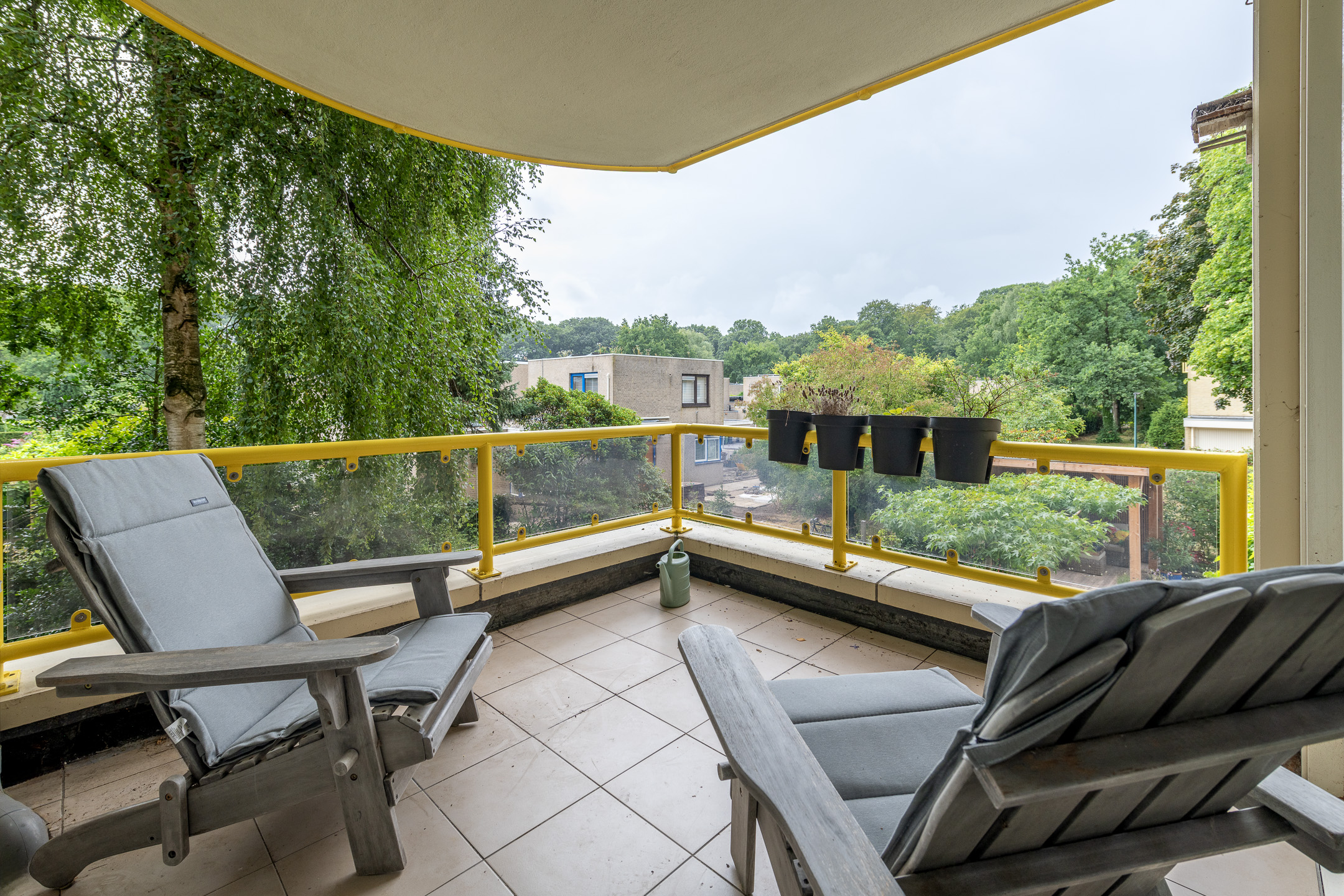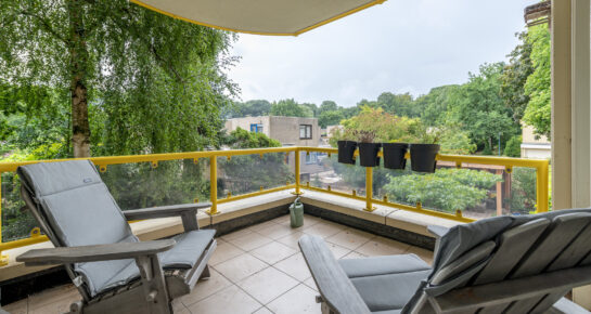 Bij binnenkomst valt direct het licht op dat door de hoekligging volop binnenvalt. De woonkamer is ruim genoeg voor een gezellige zithoek en biedt toegang tot het balkon op het zuidwesten – een fijne plek om in de middagzon te ontspannen. Door de bomen naast het appartement is het er in de zomer relatief koel en in de winter – als de bladeren gevallen zijn – kan de zon ongehinderd tot het eind van de middag naar binnen schijnen.