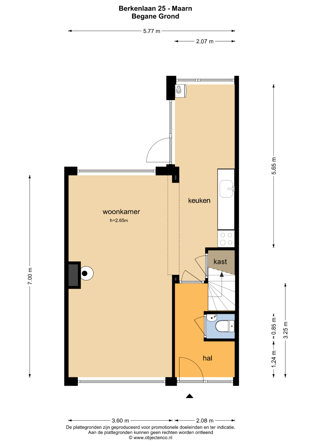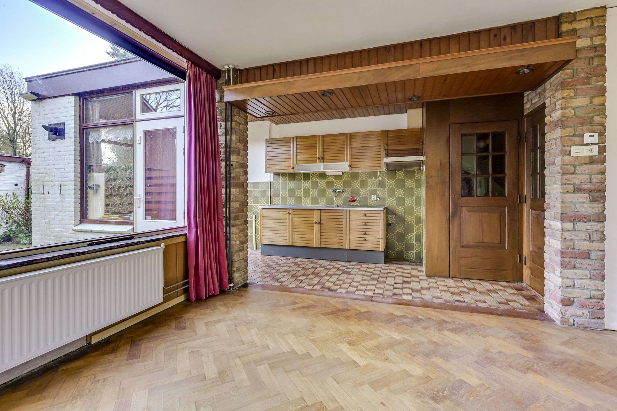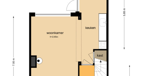 De woonkamer is praktisch ingedeeld en biedt voldoende ruimte om deze naar eigen smaak in te richten. De keuken is eenvoudig uitgevoerd en kan worden gemoderniseerd, waardoor je de mogelijkheid hebt om deze volledig aan te passen aan jouw wensen.