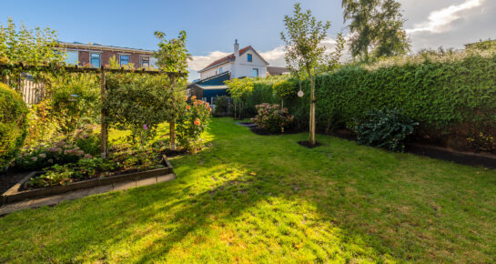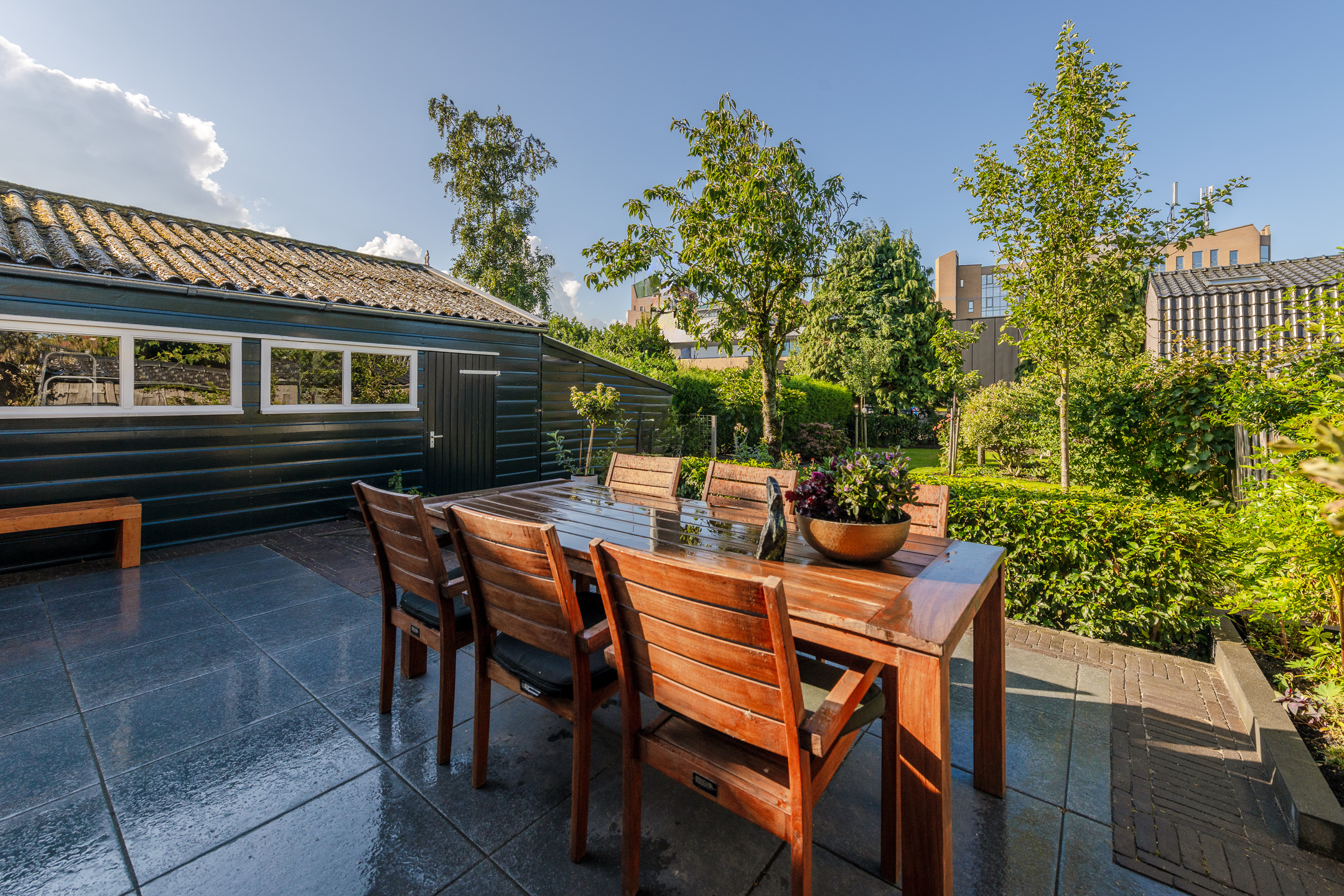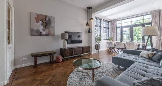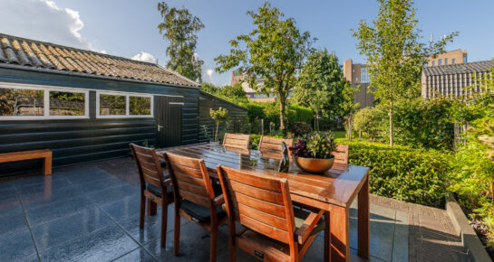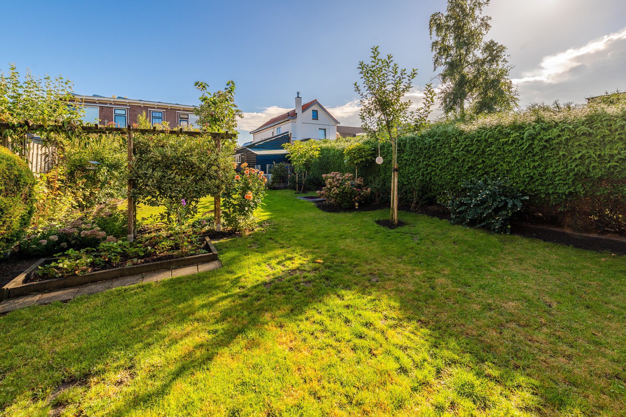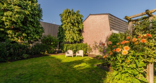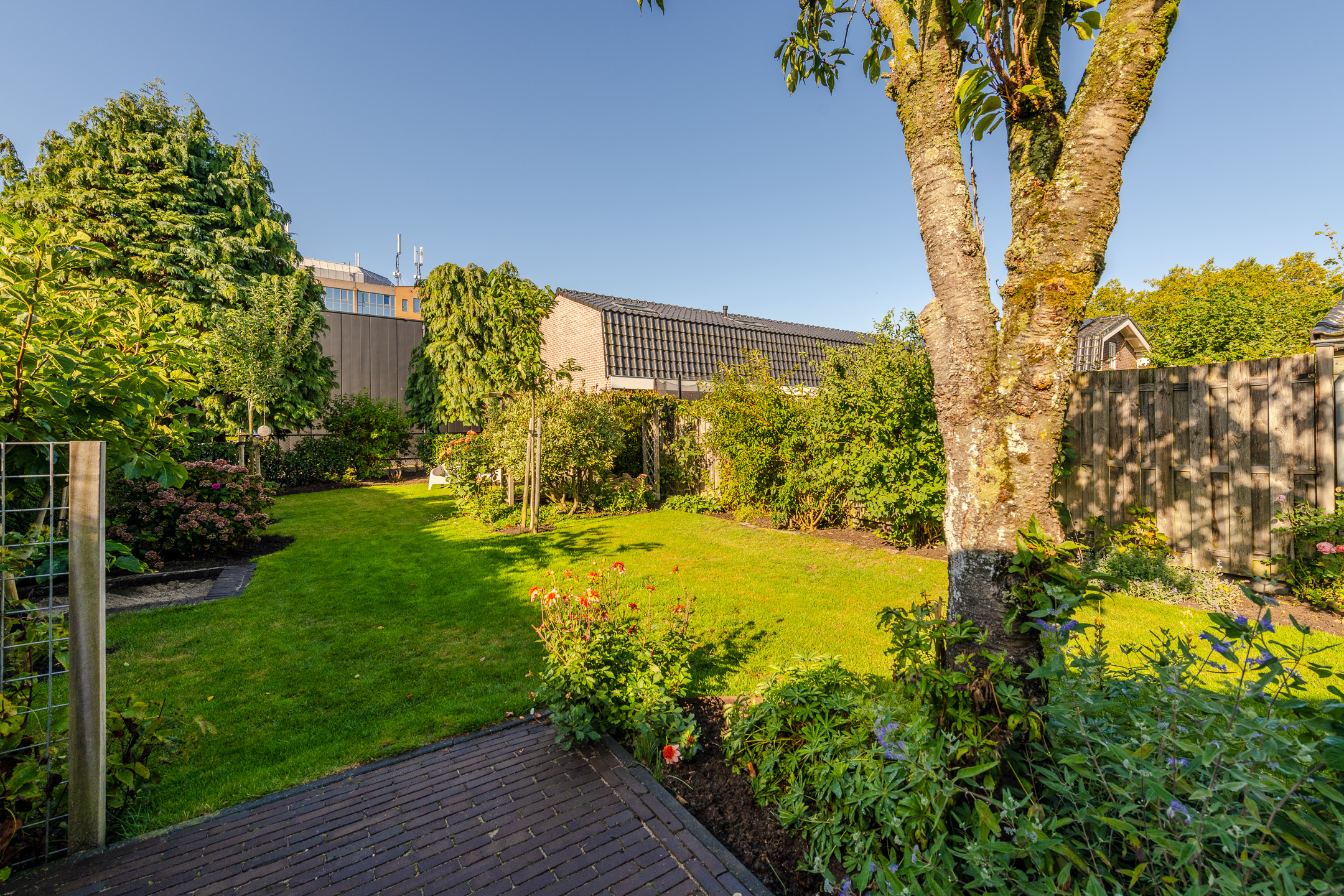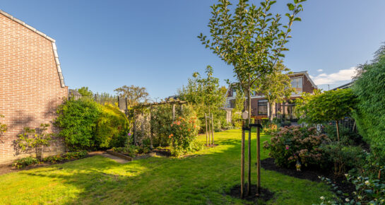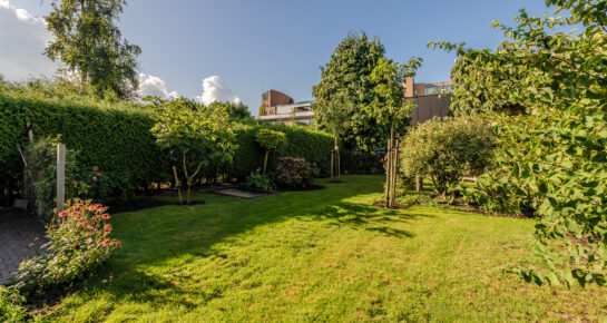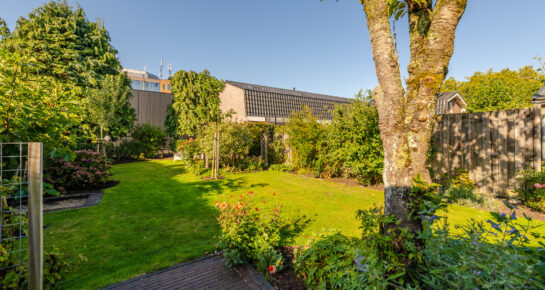 De woonkamer is licht en ruim. Via de openslaande deuren stap je zo de achtertuin in, waar je vrijwel de hele dag van de zon kunt genieten. De tuin ligt op het zuidwesten, is diep en groen en heeft diverse hoekjes. Het is een fijne plek om te ontspannen, te tuinieren of de kinderen te laten spelen.