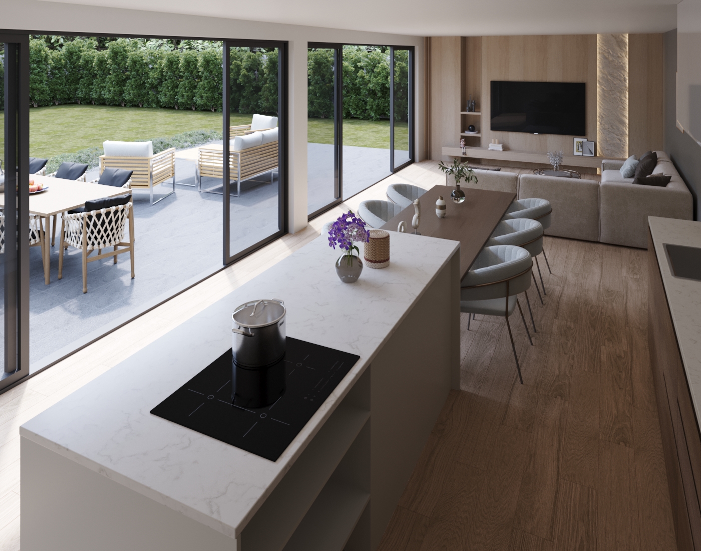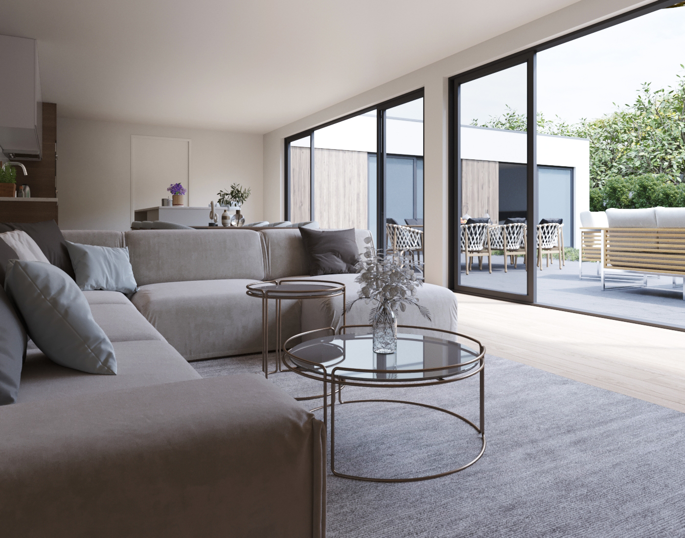 Bij binnenkomst word je verwelkomd in een ruime en lichte living. De grote ramen zorgen voor veel natuurlijk licht en bieden een prachtig uitzicht op de groene en zonnige binnentuin.